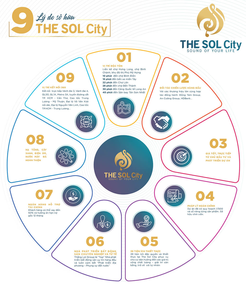 Dự án khu đô thị The Sol City nằm giáp với khu đô thị mới Nam Sài Gòn, tiếp giáp liền kề với hai huyện Bình Chánh và Nhà Bè của Thành phố Hồ Chí Minh. Điểm thú vị chính là dự án nằm tiếp giáp với 2 huyện đang chuản bị lên quận của TPHCM.